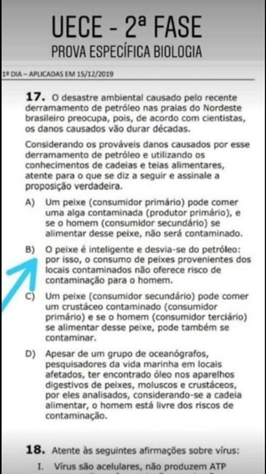 Em uma das questões de Biologia do vestibular, o enunciado pedia aos estudantes que assinalassem a questão verdadeira, tomando como base o desastre ambiental e os danos decorrentes, considerando as cadeias e teias alimentares. A alternativa b do teste fazia referência à fala do secretário: “O peixe é inteligente e desvia-se do petróleo: por isso, o consumo de peixes provenientes dos locais contaminados não oferece risco de contaminação para o homem”.