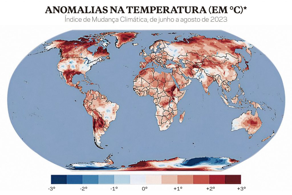 *Média diária de anomalias entre 1° de junho e 31 de agosto de 2023 Análise baseada no EMCWF Era; Temperaturas comparadas ao período 1991–2020 Fonte: Climate Central