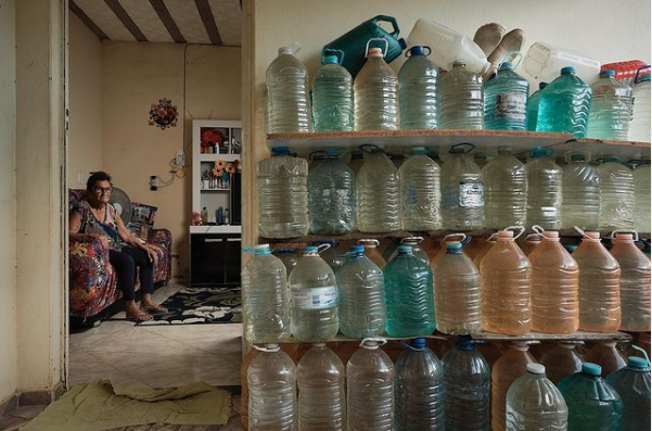 Sem condições financeiras para comprar água e por acreditar que a mineradora fornece água envenenada do Rio Doce com o rótulo de potável, a aposentada Delcina Pereira de Lima passou a coletar e armazenar a água da chuva (Foto: Thomas Byczkowski)